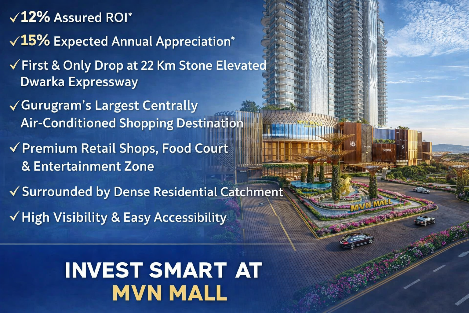 MVN Mall is a landmark commercial development strategically located on the prestigious Dwarka Expressway, one of the fastest-growing investment corridors in NCR. Designed to redefine retail and entertainment experiences, this iconic destination offers unmatched visibility, high footfall potential, and excellent connectivity. Positioned at a prime drop location on the elevated expressway, MVN Mall enjoys seamless access from Gurugram and Delhi, making it a high-demand commercial hotspot for brands, retailers, and investors. 🔹 Key Highlights: ✔ 12% Assured ROI* ✔ 15% Expected Annual Appreciation* ✔ First & Only Drop at 22 Km Stone Elevated Dwarka Expressway ✔ Gurugram’s Largest Centrally Air-Conditioned Shopping Destination ✔ Premium Retail Shops, Food Court & Entertainment Zone ✔ Surrounded by Dense Residential Catchment ✔ High Visibility & Easy Accessibility MVN Mall is not just a shopping destination — it is a future-ready commercial investment opportunity offering strong rental returns and long-term capital growth potential.